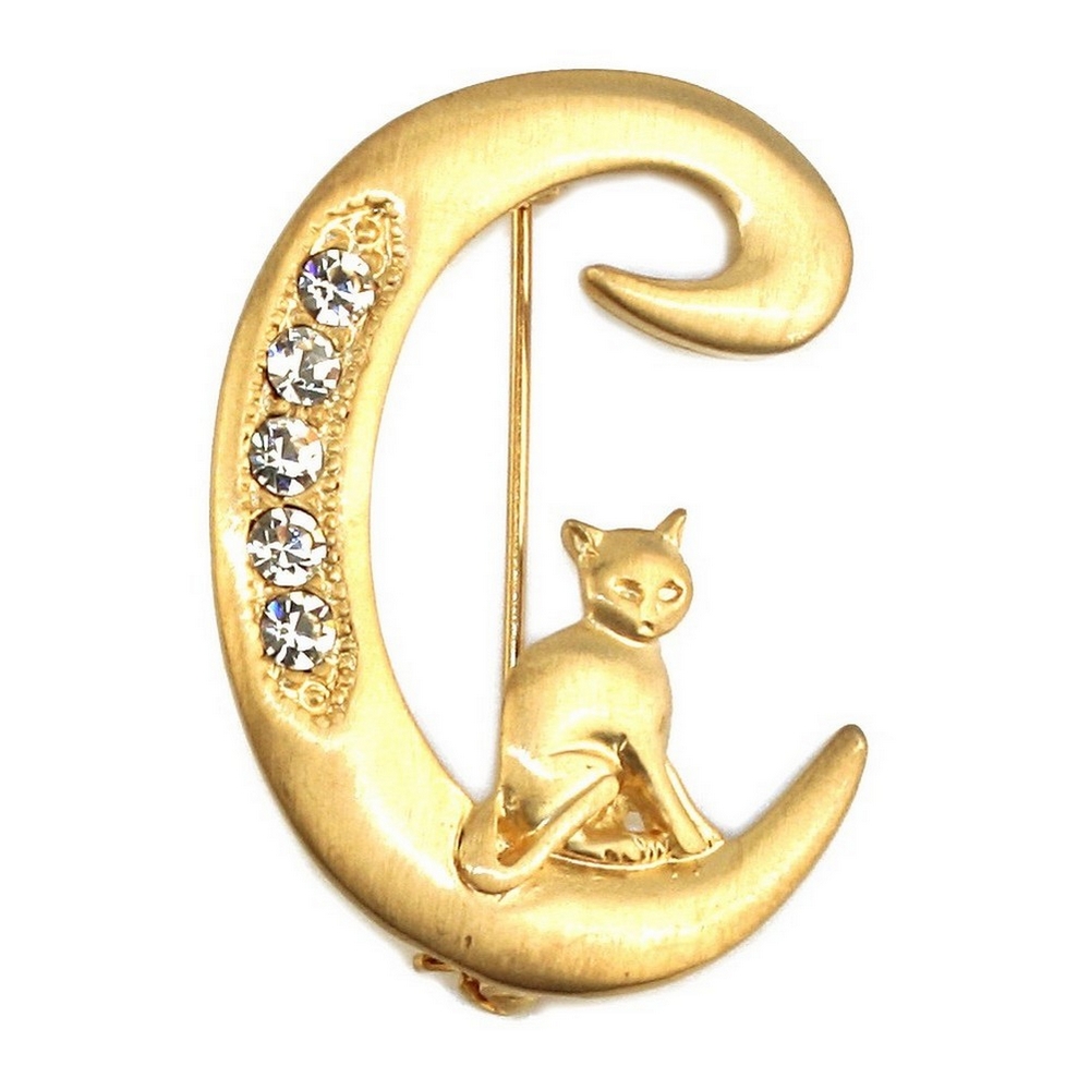 Brooch Gold Plated Initial ‘c’ With A Climbing Cat Made With Pewter & Crystal Glass