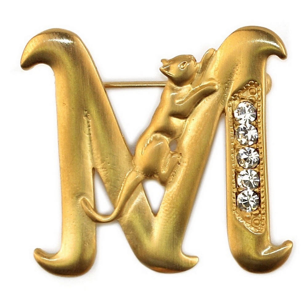 Brooch Initial ‘m’ Cat/stones Made With Pewter & Gold Plated