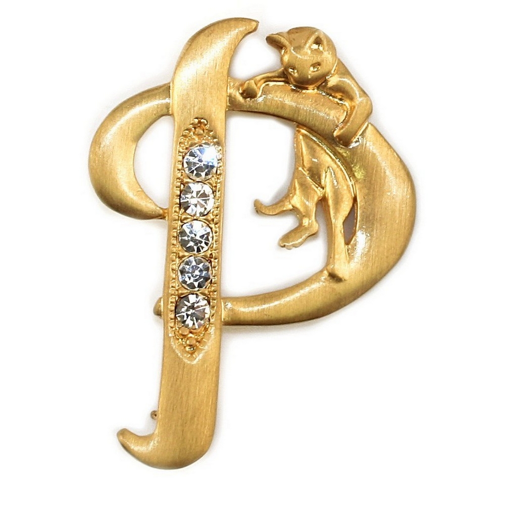 Brooch Initial ‘p’ Cat/stones Made With Pewter & Gold Plated