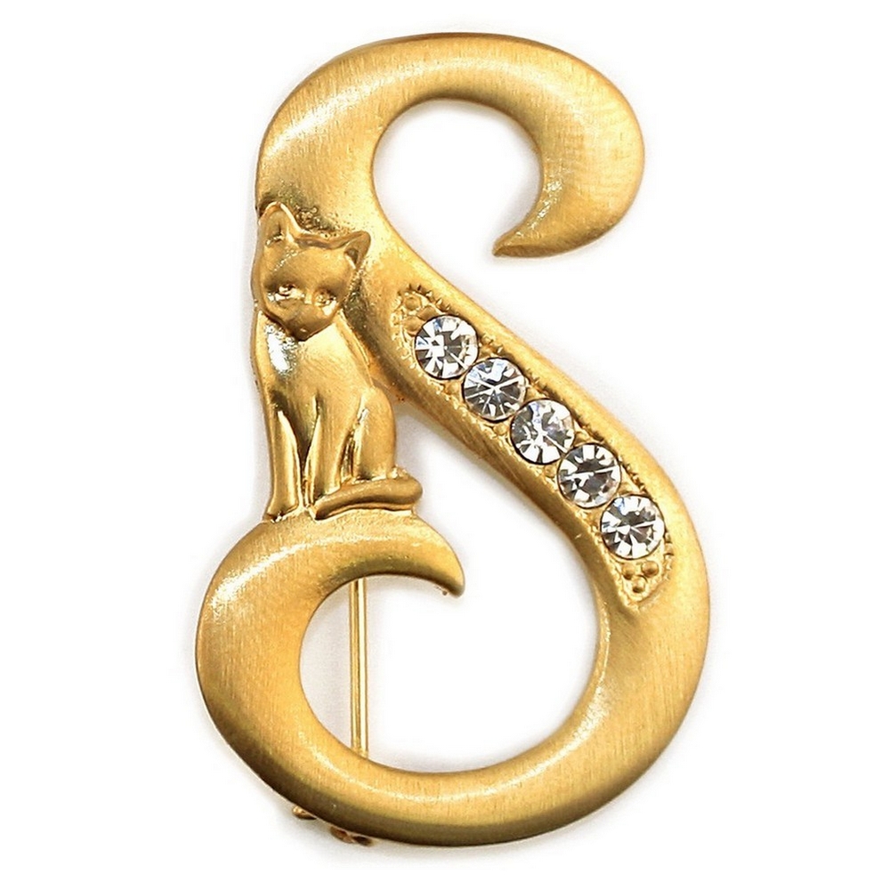 Brooch Initial ‘s’ Cat/stones Made With Pewter & Gold Plated