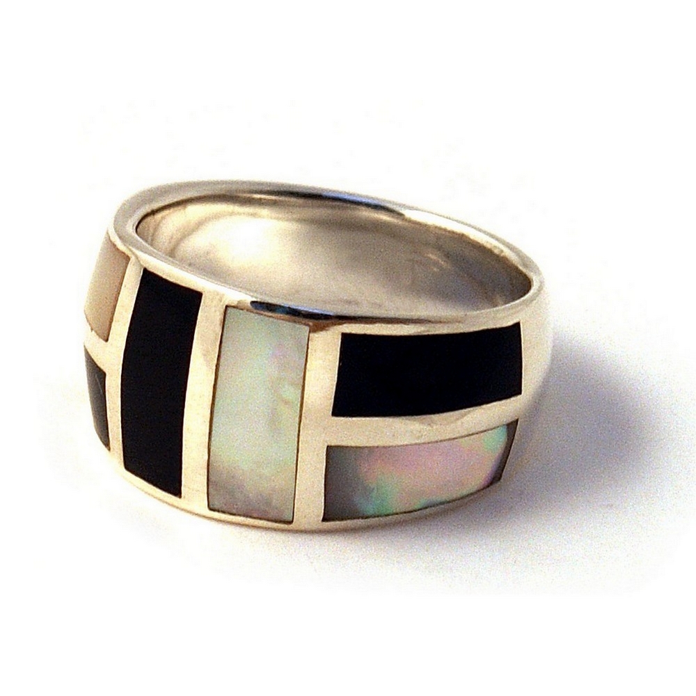 Ring Blk/w 6 Rectangle Front Made With 925 Silver & Shell