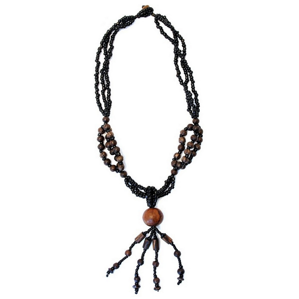 Necklace With A Pendant 3 Strand 8mm Bead With Tassel Made With Wood