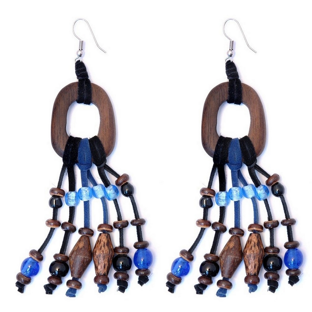 Drop Earring Blue 6 Row Drop 27x35mm Rect Made With Wood & Leather