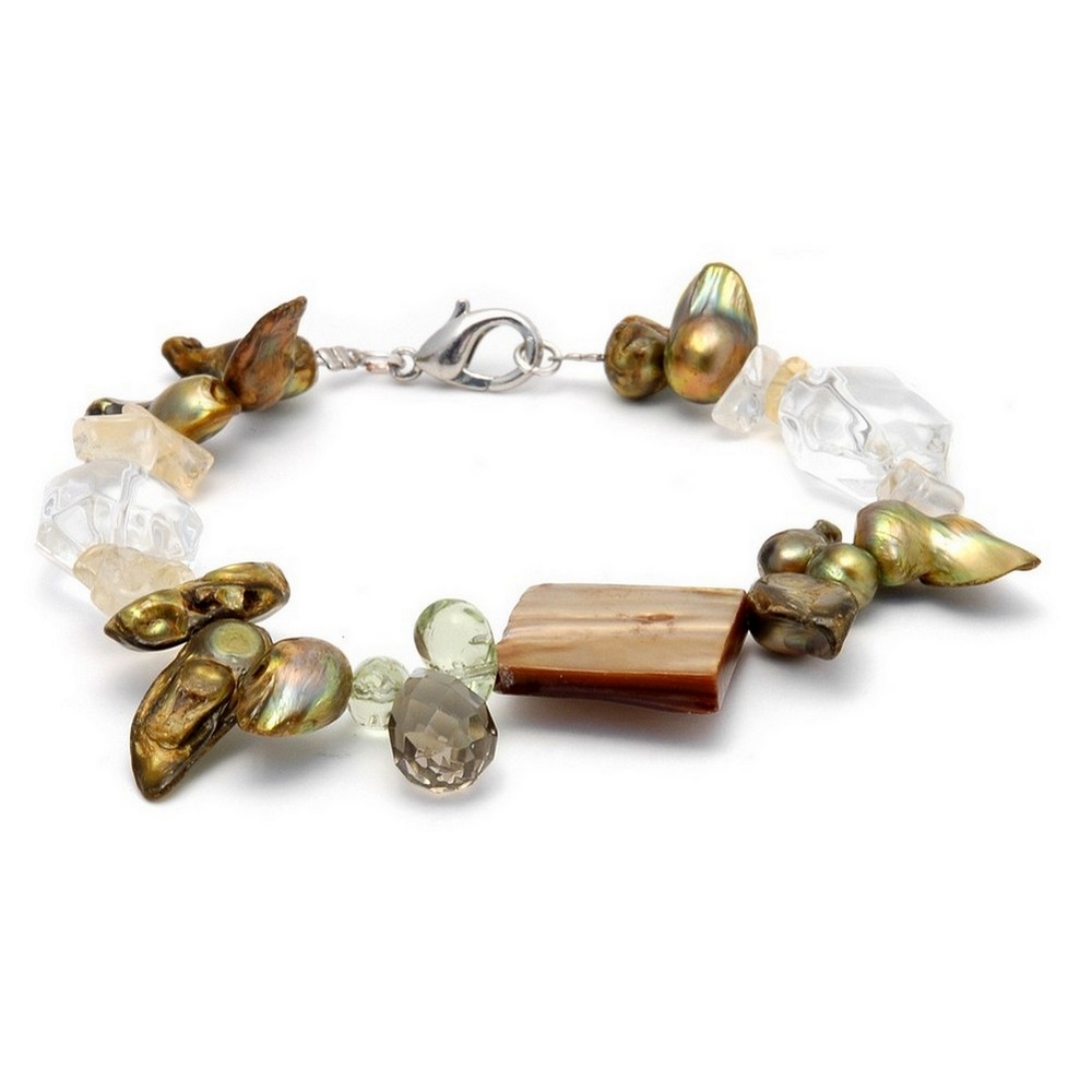 Bracelet Clear & Green With Gold Squares Made With Stone & Shell