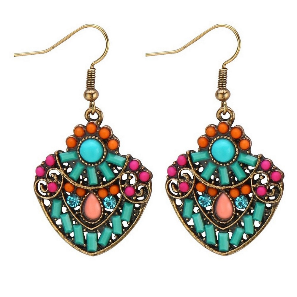 Be the first to review “Drop earring enamel embellished shield gold, orange & turquiose”