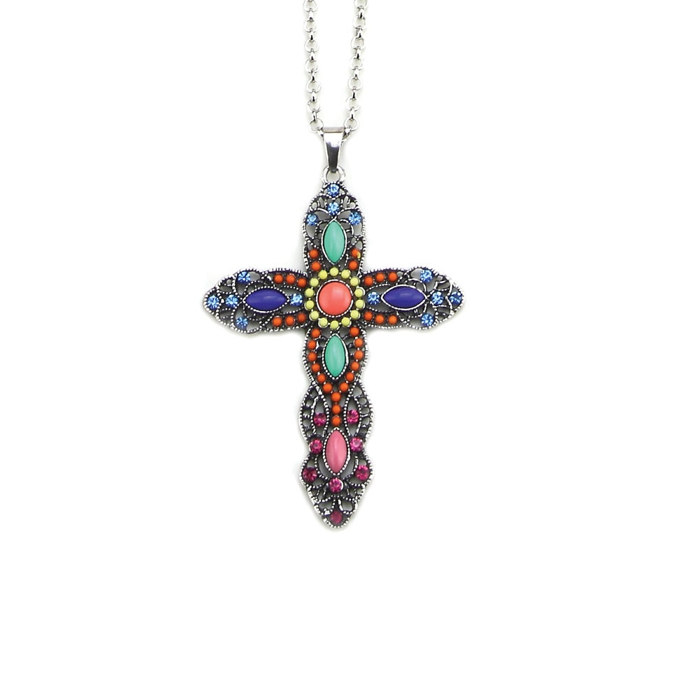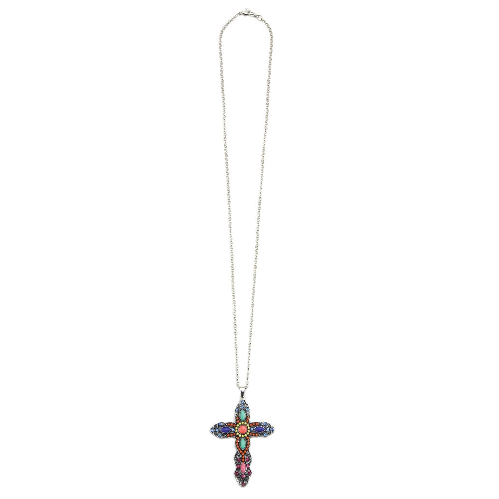 A beautifully embellished cross on a pendant, this will enrich your life as well as your collection. With a hint of the exotic, this really has an eastern glamour. The handmade work in glaass and enamel add a real richness to this piece