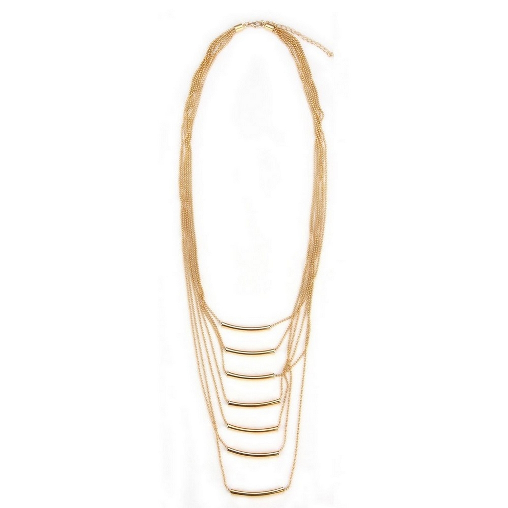This multi-strand necklace strung with tubular sections is a masterful innovation in jewellery. Elegant yet edgy, this is pure cool design. Beautifully constructed in gold finish iron, this is a perfect accessory for day or night. This product is an essential addition to your accessory wardrobe.
