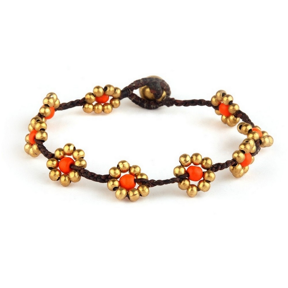 Bracelet brass & cord flower bead coloured centre & bell catch orange