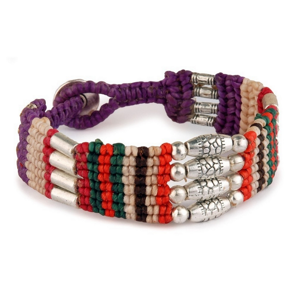 This bracelet will become a favourite accessory. With echoes of mexican glamour, this will add an exotic richness to your outfit. Elaborately constructed in colourful cotton cord and etched metal beads, this will flatter any look. This richly textured bracelet will bring years of pleasure.