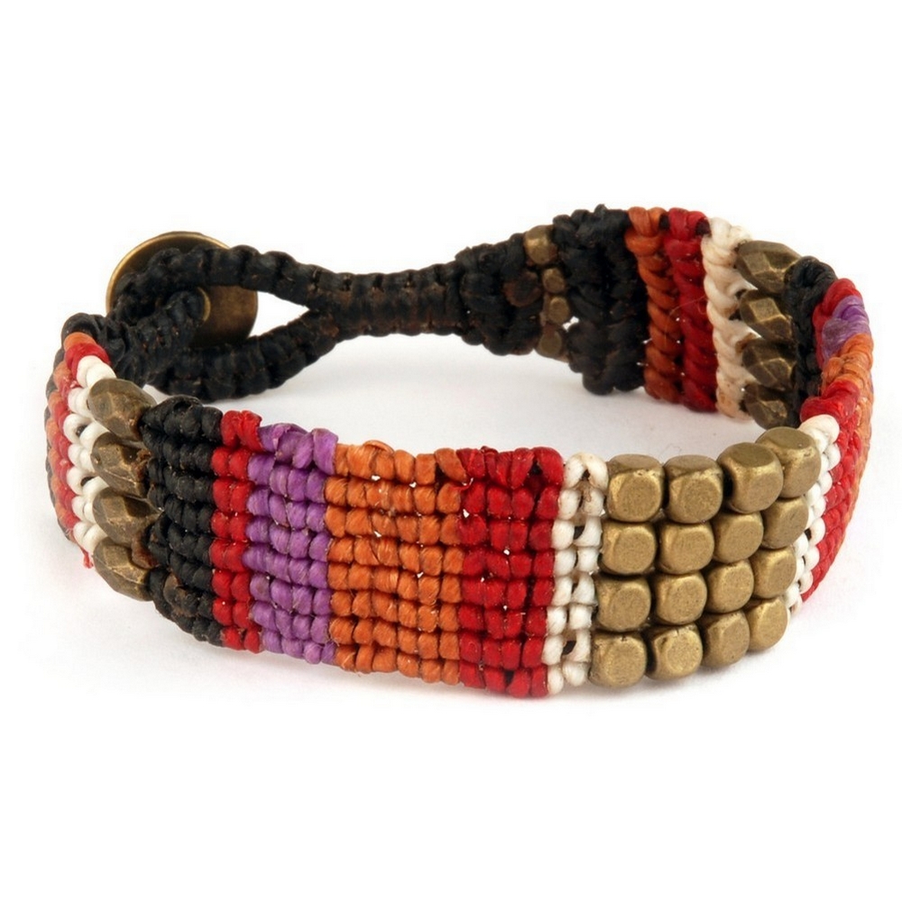 This bracelet will become a favourite accessory. With echoes of mexican glamour, this will add an exotic richness to your outfit. Elaborately constructed in colourful cotton cord and etched metal beads, this will flatter any look. This richly textured bracelet will bring years of pleasure.