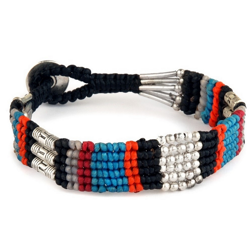 This bracelet will become a favourite accessory. With echoes of mexican glamour, this will add an exotic richness to your outfit. Elaborately constructed in colourful cotton cord and etched metal beads, this will flatter any look. This richly textured bracelet will bring years of pleasure.
