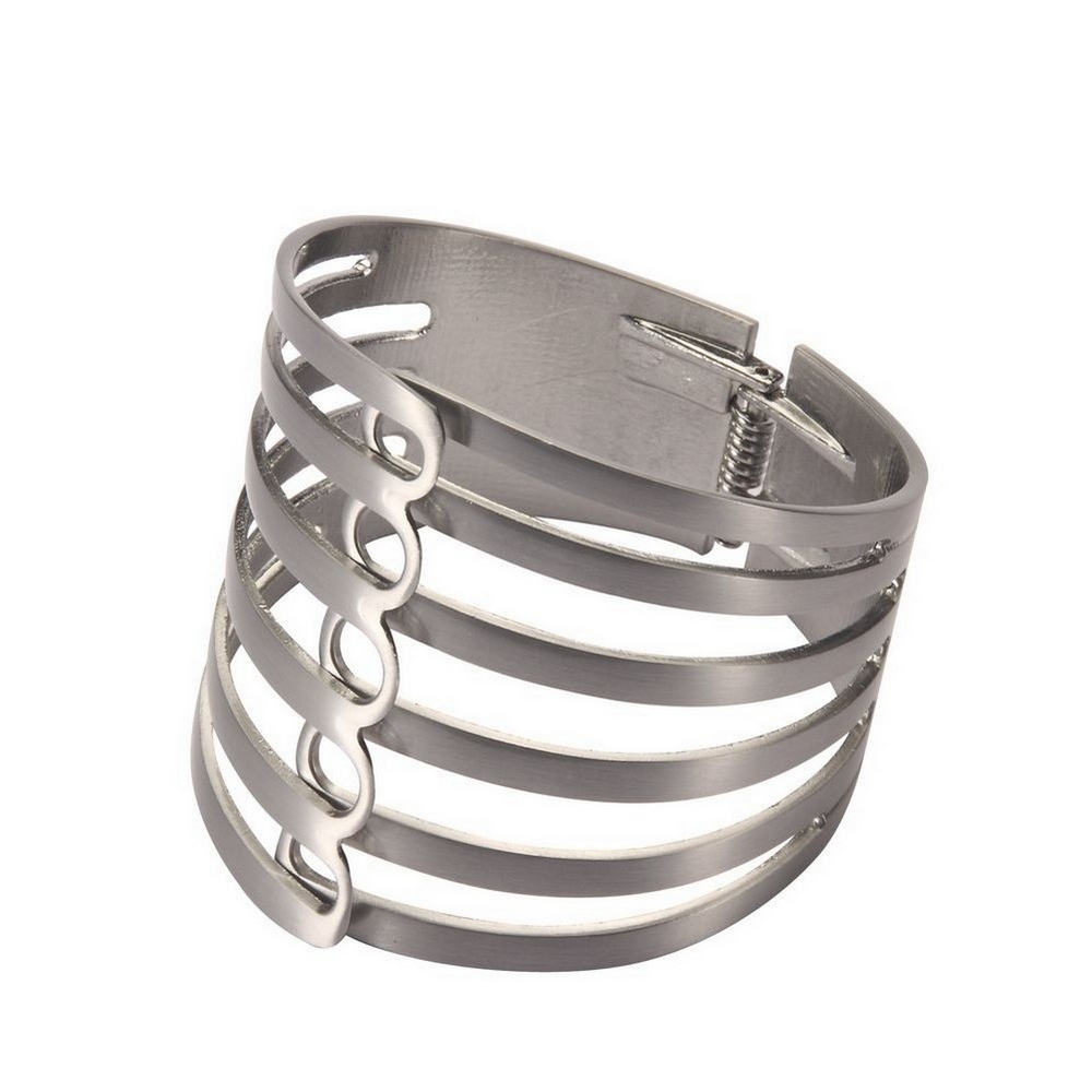 This hinged bangle is a masterful innovation in jewellery. Skillfully made in brushed metal, this item will not fail to impress. A terrific brushed zinc alloy item for the truly discerning customer. Look sharp, stay cool and shine on!