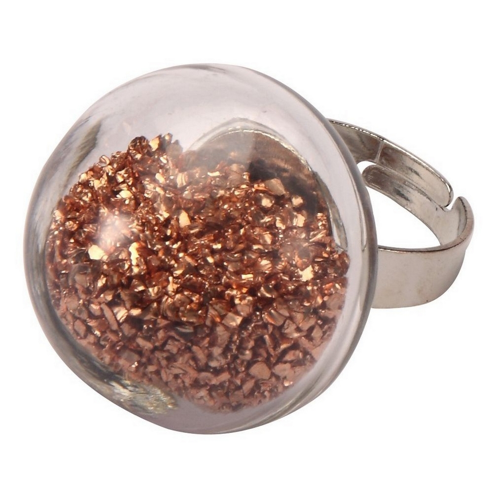 Add a bit of sparkle with this beautiful glass glitter ring. Classy and cool, clean modern design makes this fun piece of fashion jewellery into a real statement piece. An adjustable metal shank with its gleaming glass bubble filled with warmly glowing copper glitter makes this an ideal gift to that special person or to yourself!