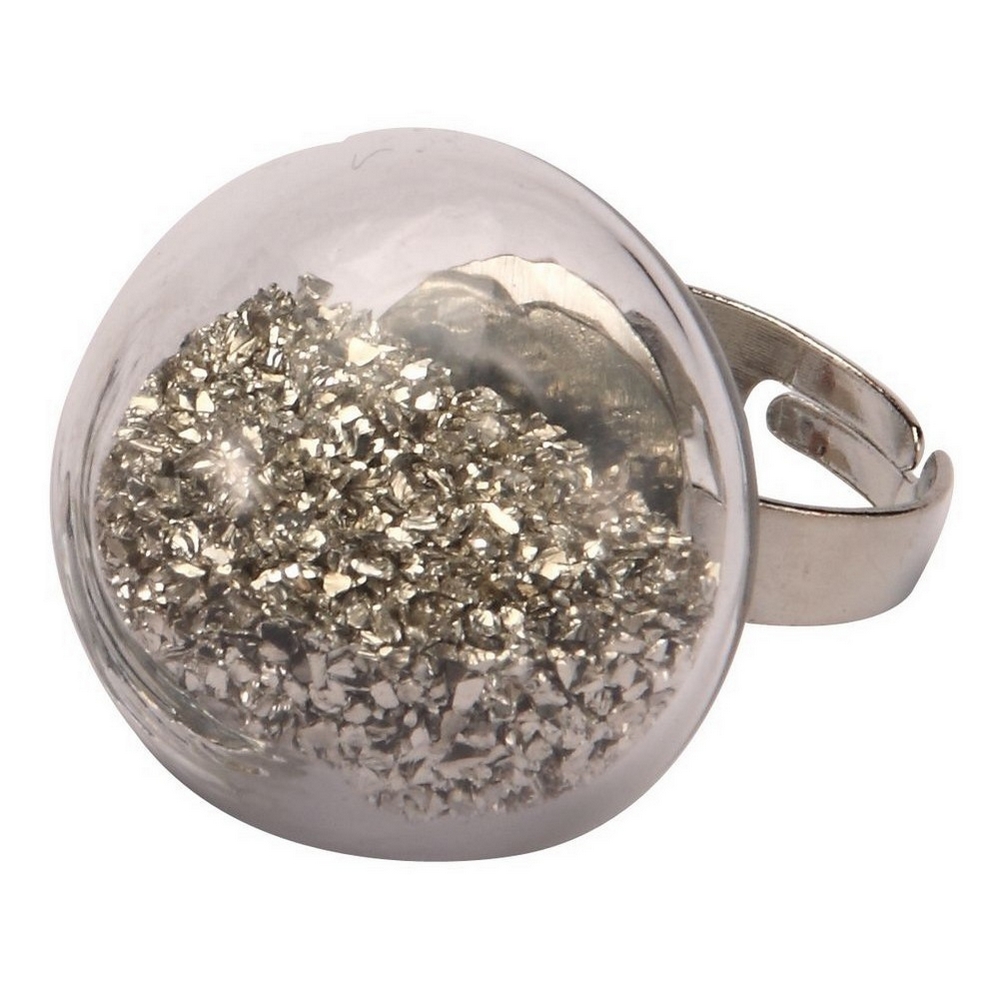 Add a bit of sparkle with this beautiful glass glitter ring. Classy and cool, clean modern design makes this fun piece of fashion jewellery into a real statement piece. An adjustable metal shank with its gleaming glass bubble filled with classic silver glitter makes this an ideal gift to that special person or to yourself!