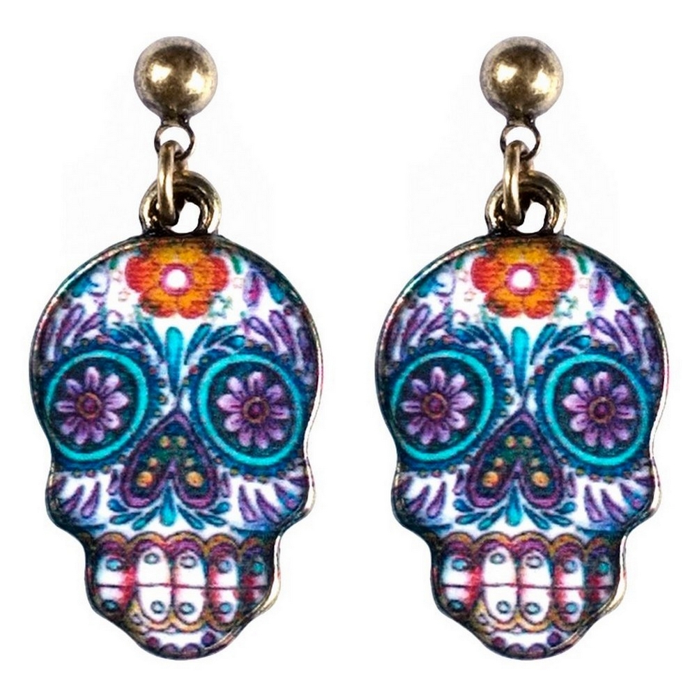 Be the first to review “Stud & drop earring enamel skull blue with orange flower”