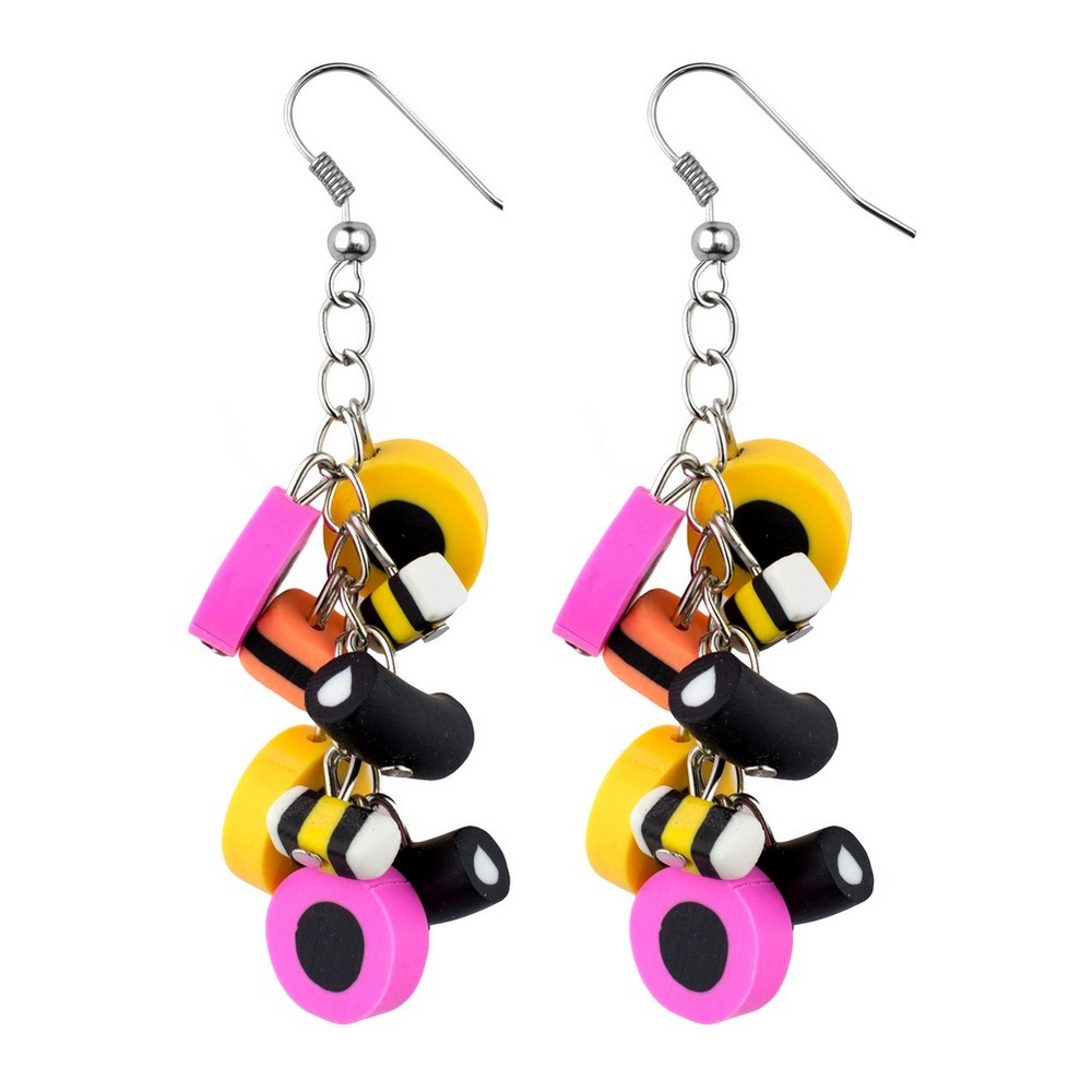 Unique Craftsmanship Crafted from vibrant, multi-coloured resin, each earring captures the iconic layers and shapes of the beloved liquorice allsort. From the classic pink-and-black rounds to the yellow-and-white squares, these earrings are designed to look just like the real thing.