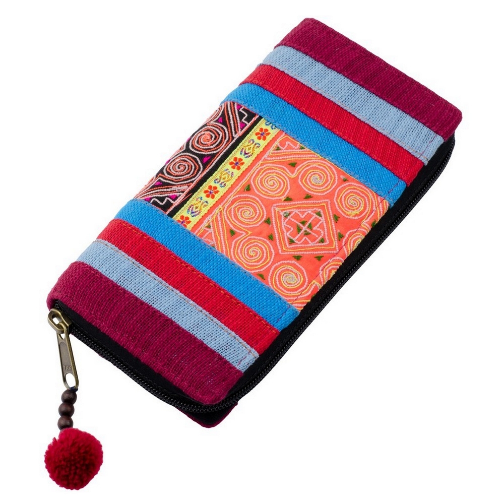 Zip Wallet Handmade Patchwork And Stripe Pompom Made With Fabric