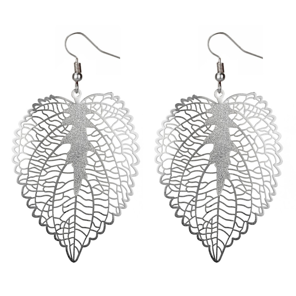 Drop earring etched leaf matte silver