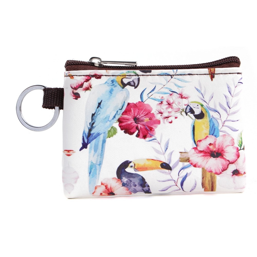 Coin purse zipped tropical feathers & flowers toucan & blue macaw