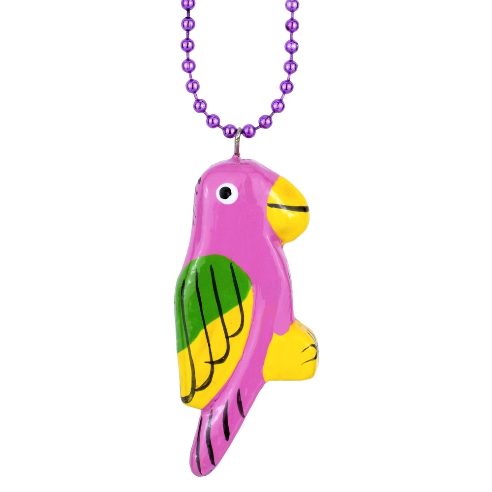 Crafted from lightweight wood, each parrot is meticulously hand-carved and painted, ensuring no two are precisely alike. The smooth, lacquered finish of its plumage catches the light, revealing a spectrum of tropical colours – a vivid pink, a brilliant blue, a sun-kissed yellow – that seem to pulse with life. The tactile warmth of the wood against the skin offers a grounding counterpoint to its exuberant visual presence.
