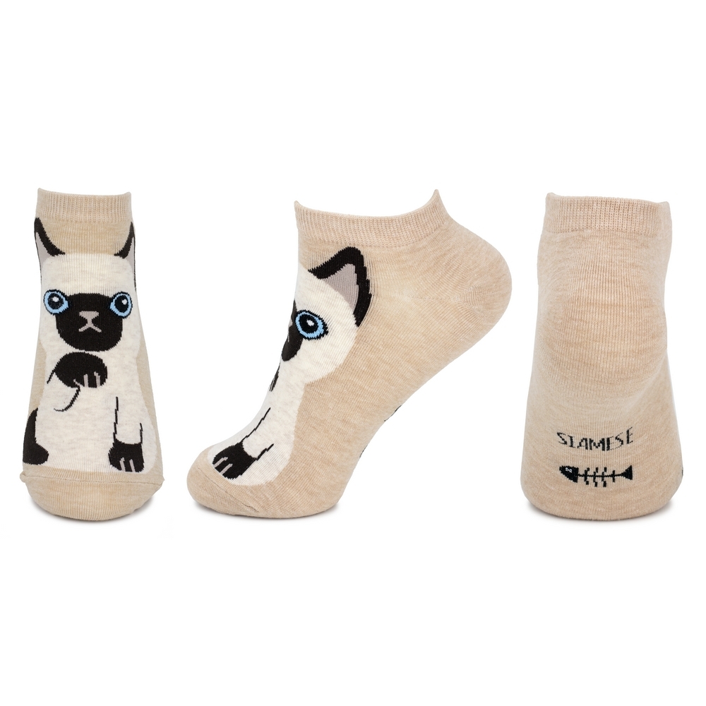 The delicate illustration of a Siamese cat, with its distinctive points and intelligent gaze, is rendered with subtle artistry against a refined base. Woven from a premium cotton and spandex blend, the fabric offers a gentle, breathable embrace, ensuring a comfortable fit that moves with you throughout the day. The fine-gauge knit provides a smooth, refined finish, making these a pleasure to wear and behold.