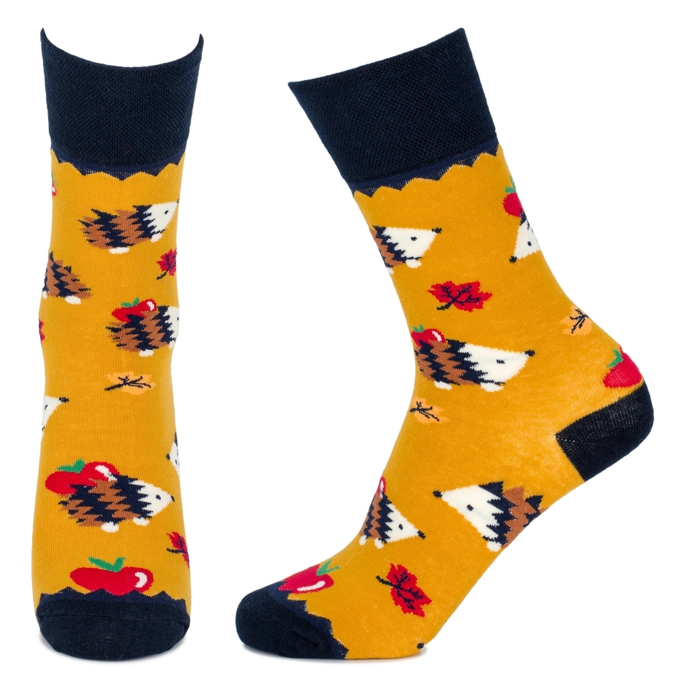 A sweet and autumnal treat! Our apple hedgehog socks are a charming and adorable choice for the autumn season. The cute hedgehog and apple design, combined with the warm ochre yellow colour, creates a cosy and heartwarming feel. A popular choice for animal lovers, these socks are a lovely addition to any collection.