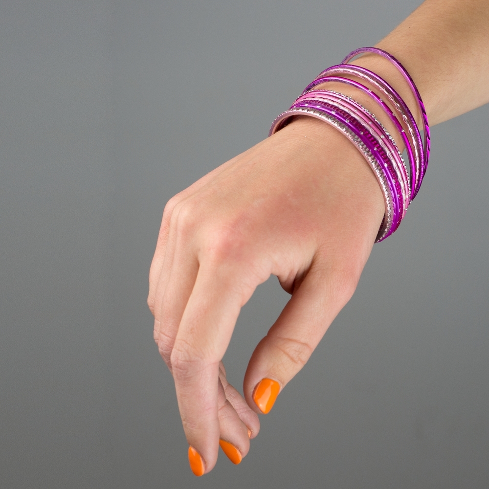 A selection of 12 fine aluminium diamond cut bangles of different colours and effects which when worn fall comfortably to cover the wrist to give a unique and eye catching effect.