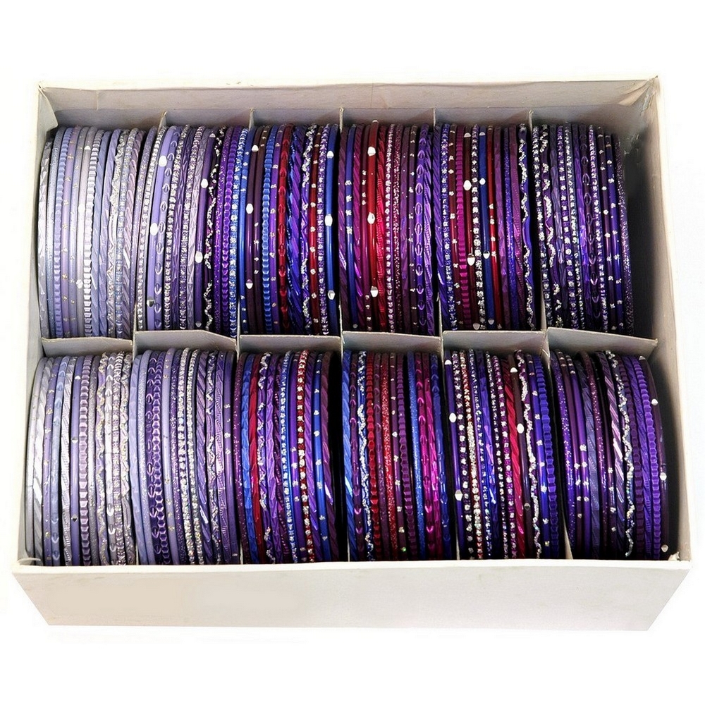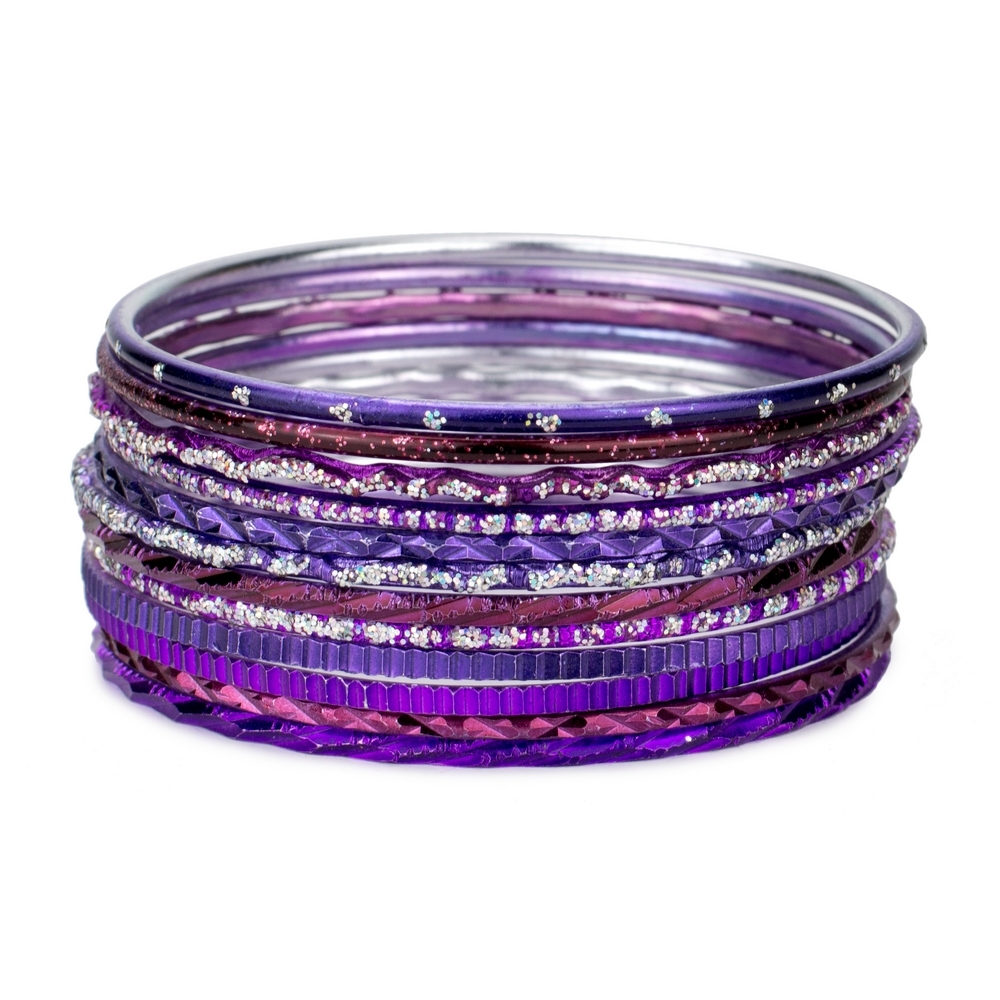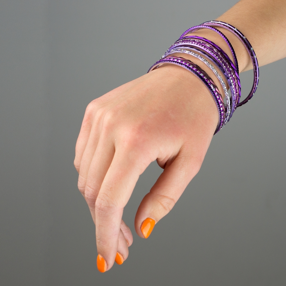 A selection of 12 fine aluminium diamond cut bangles of different colours and effects which when worn fall comfortably to cover the wrist to give a unique and eye catching effect.