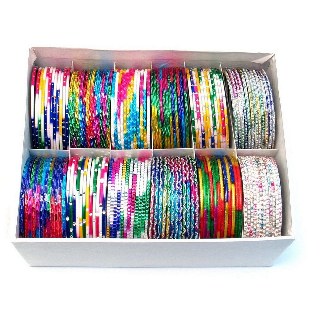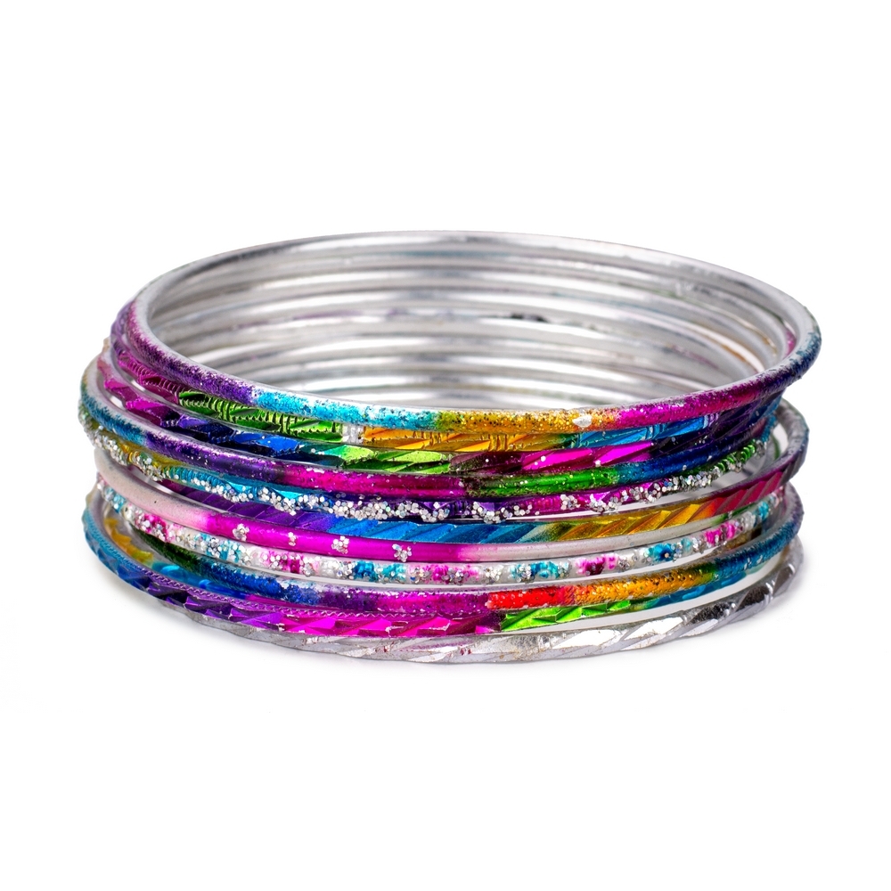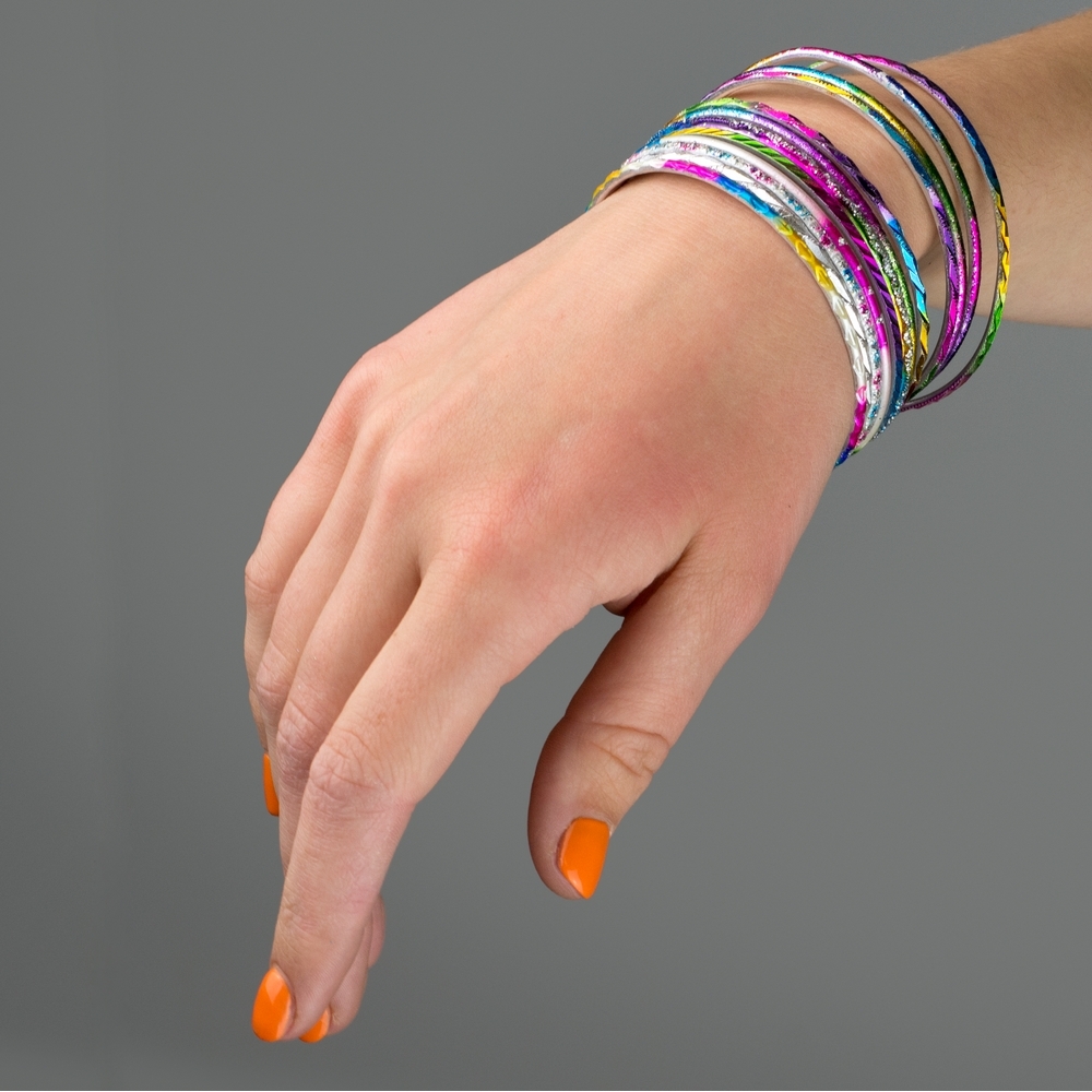 A selection of 12 fine aluminium diamond cut bangles of different colours and effects which when worn fall comfortably to cover the wrist to give a unique and eye catching effect.