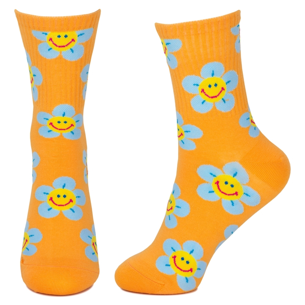 Crafted from a breathable cotton blend with a hint of resilient spandex, these socks offer a gentle, form-fitting embrace. Each pair unfurls a charming narrative of smiling floral faces, rendered in a palette of optimistic hues that evoke the warmth of a sun-drenched garden. The fine-knit construction ensures a smooth, soft touch against the skin, promising comfort that lasts from dawn till dusk.