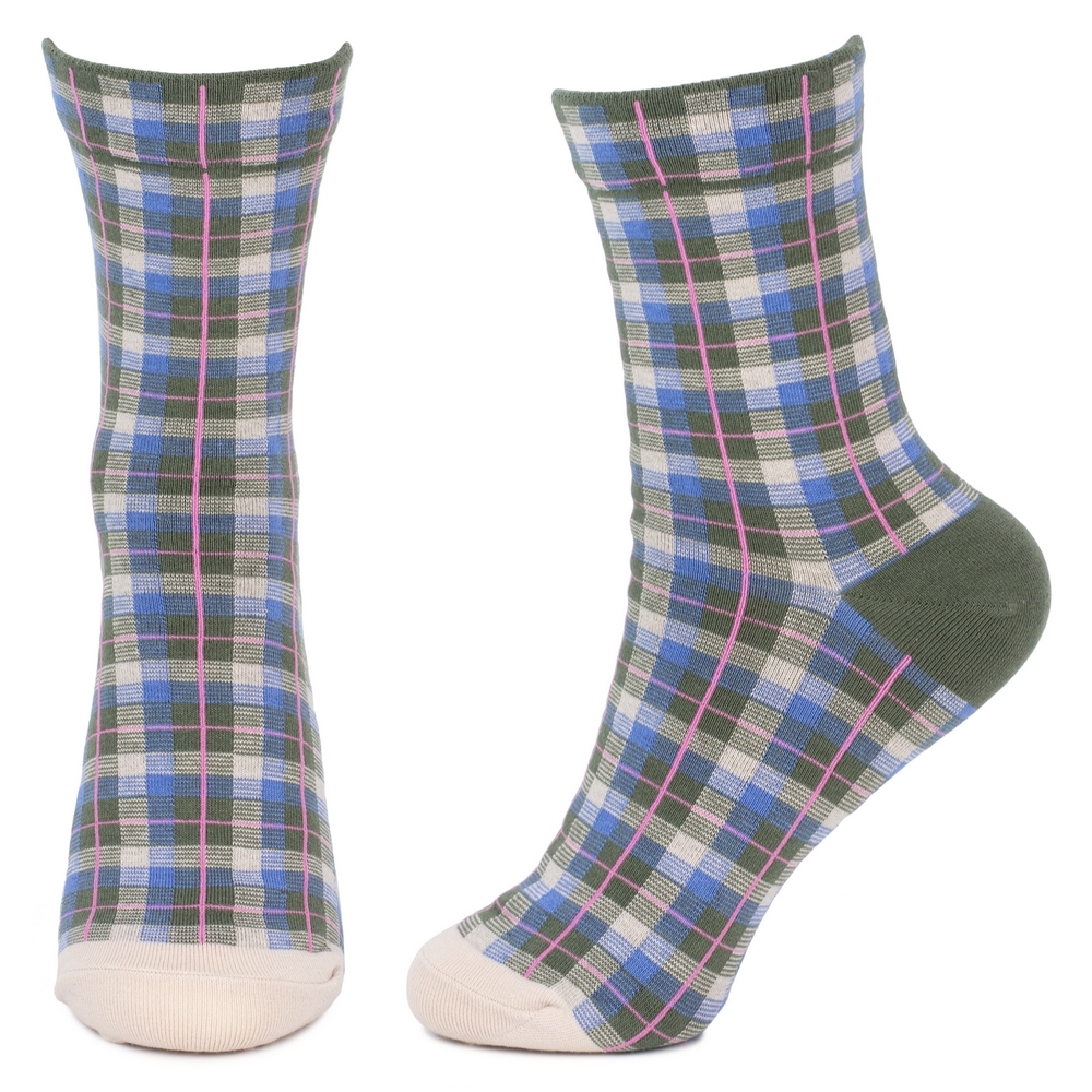 Crafted from a supple cotton-spandex blend, each pair offers a gentle embrace to the foot, ensuring comfort without compromising on form. The intricate dance of checks and tartans, rendered in a spectrum of sophisticated hues, reveals a meticulous attention to detail, inviting a closer look at the subtle interplay of lines and colour. The fine knit feels luxurious against the skin, promising both warmth and breathability.