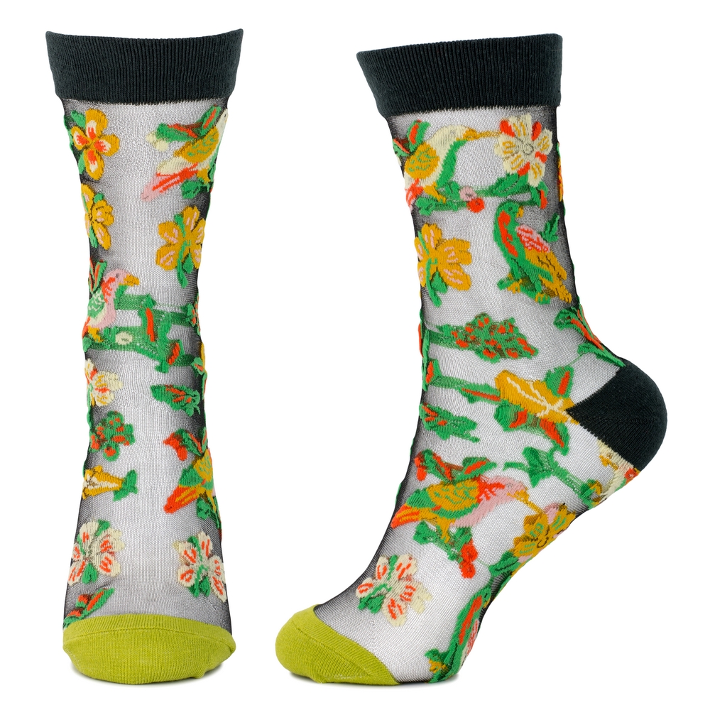 Woven with meticulous detail from a fine cotton and nylon blend, their delicate transparency reveals an enchanting tableau of tropical flowers and whimsical love birds. The jacquard technique lends a subtle, tactile dimension, creating a visual depth that shifts with every movement. They feel feather-light against the skin, a gentle caress that belies their intricate artistry, inviting a moment of quiet delight with each wear.
