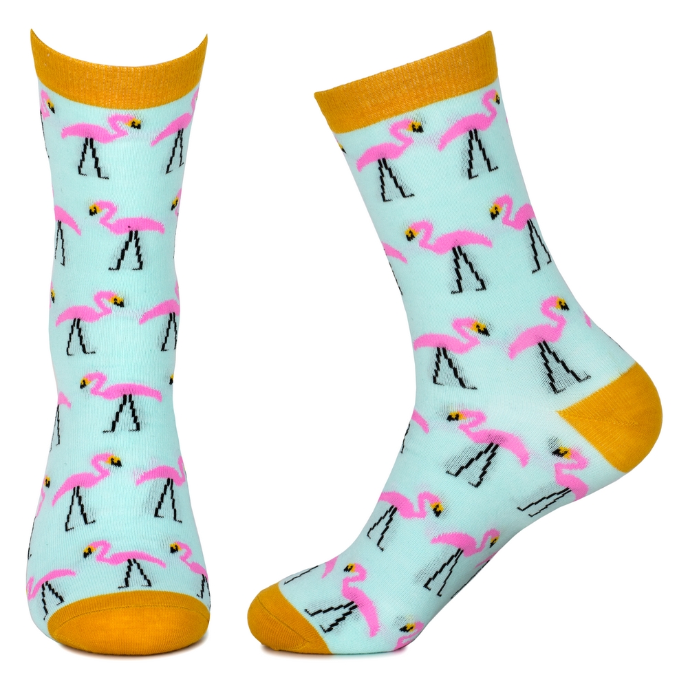 Crafted from a premium blend of breathable cotton and a hint of resilient spandex, they embrace the foot with a gentle, yielding comfort. The design unfurls a vivid tableau of graceful flamingos, their slender forms and delicate wings rendered in a painterly fashion against a backdrop of lush, verdant foliage. Each stride becomes a subtle dance of colour and form, a whisper of distant shores and sun-drenched days.