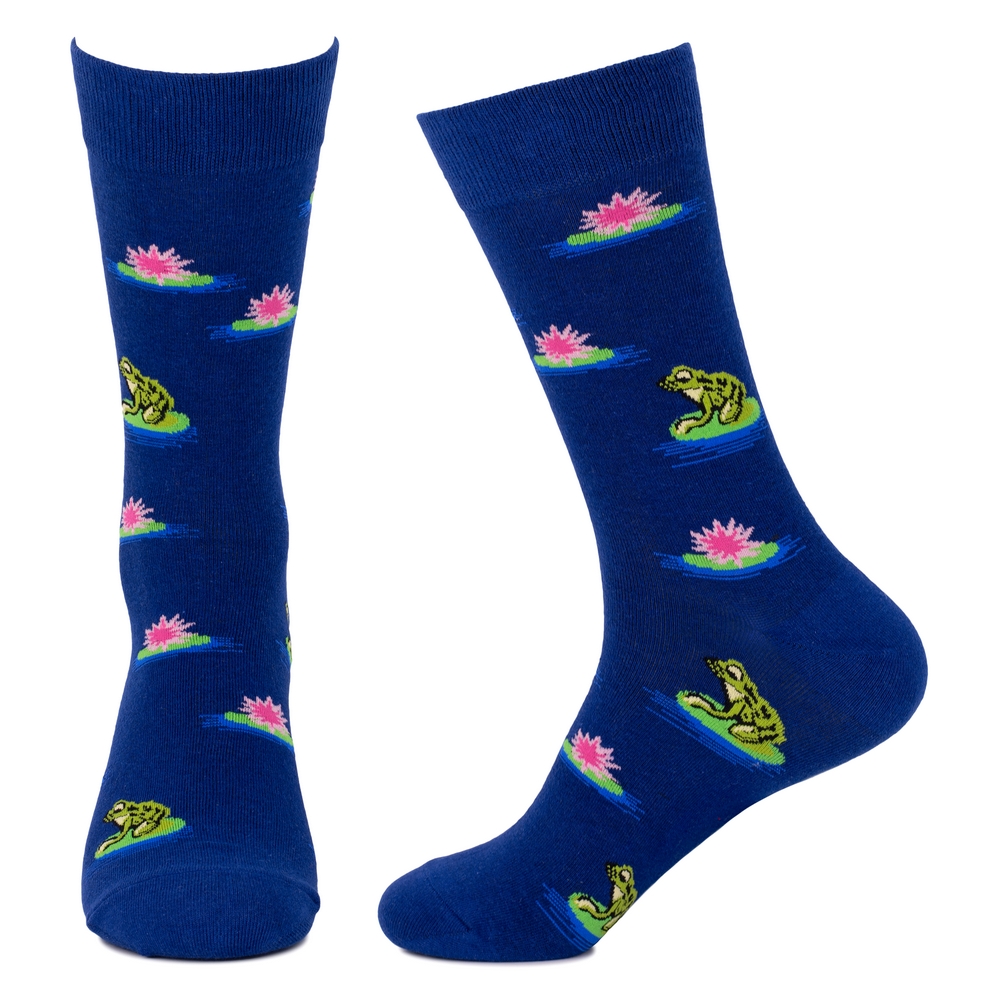 Crafted from a breathable cotton-spandex blend, they offer a gentle embrace, their fine-gauge knit a testament to comfort and quality. The design unfolds a serene tableau: a vibrant lotus pad, upon which a tiny frog perches, surrounded by the subtle ripples of water and the delicate dance of unseen insects. The palette of verdant greens, deep blues, and earthy creams evokes the quietude of a sun-dappled aquatic haven.