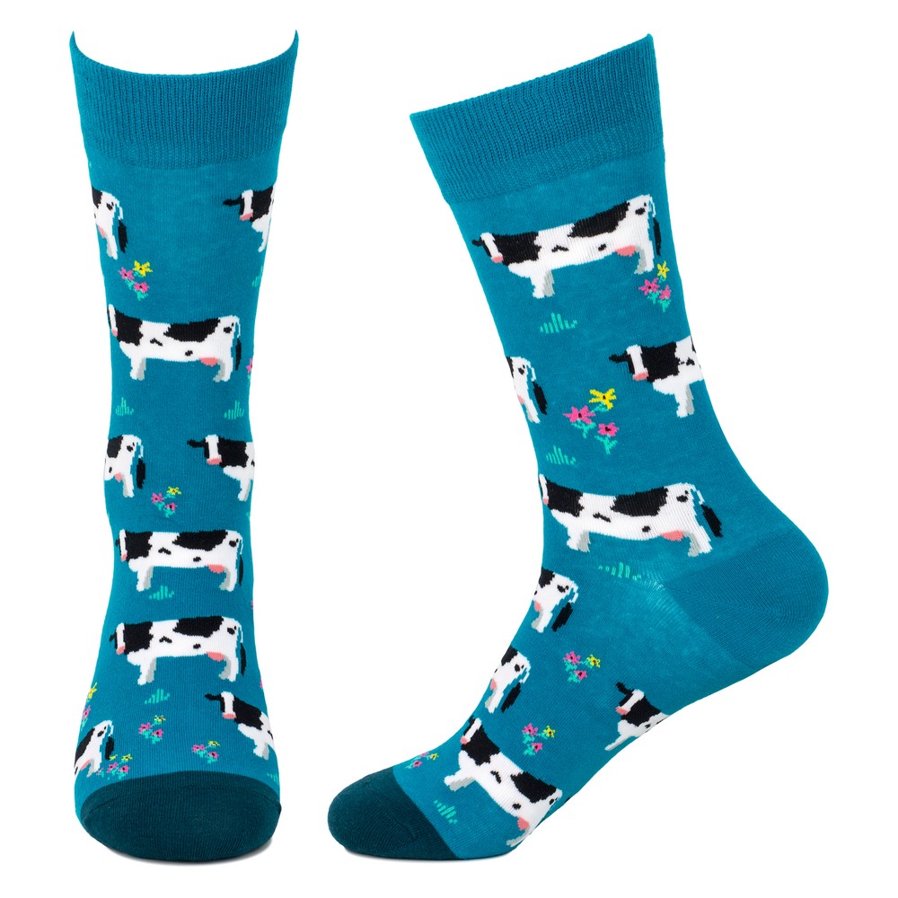 Moo-ve over boring socks! Our Friesian cow print socks are a fun and quirky addition to any collection. The eye-catching teal blue colourway and classic cow print design make these socks a popular choice for customers looking for something a little different. The high-quality cotton and spandex blend ensures a comfortable and durable product. A great conversation starter and a proven seller, these socks are a fantastic way to add a touch of fun to your inventory.