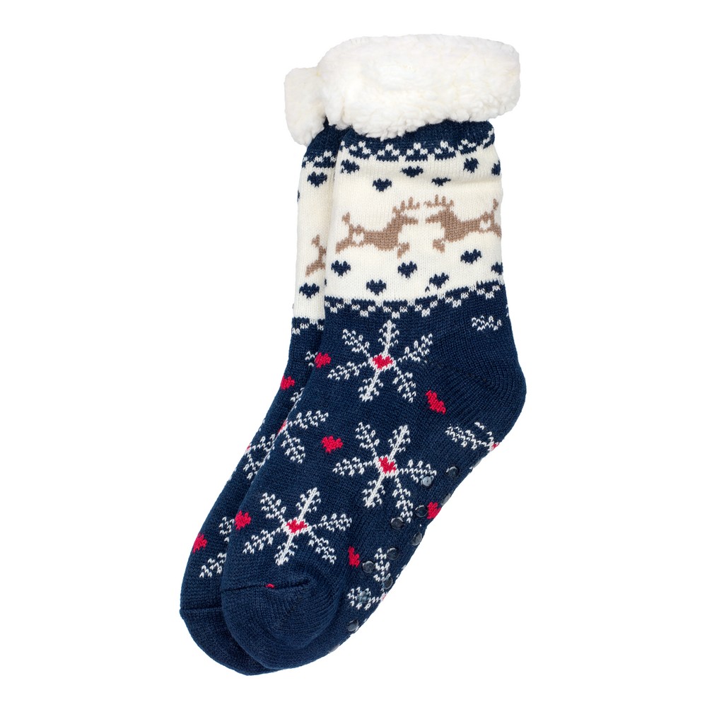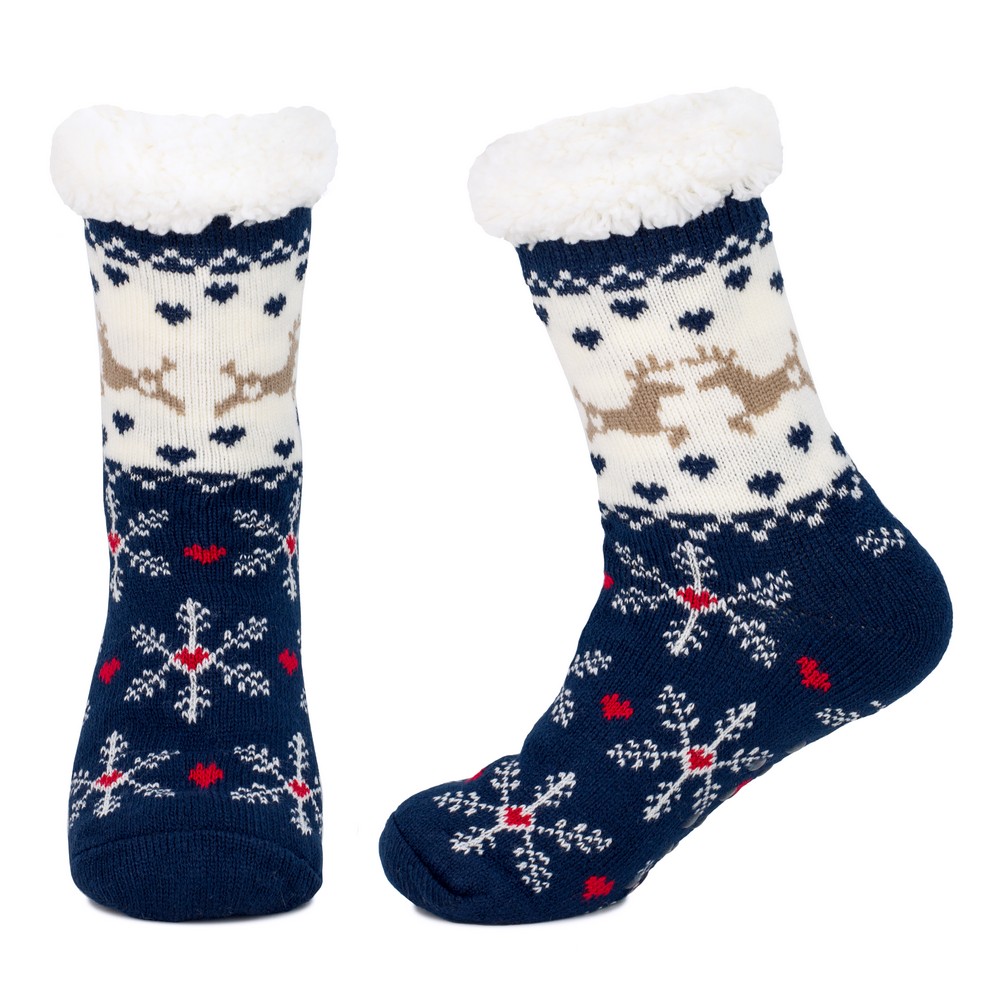 Stay cozy this winter with these festive navy blue socks, featuring a charming combination of reindeer, snowflakes, and heart patterns. Designed for both warmth and style, the soft, insulating fabric ensures all-day comfort, making them perfect for lounging or pairing with boots on chilly days. The cream-colored band with delicate reindeer motifs adds a seasonal touch, while the fluffy white cuff enhances coziness. Whether you’re looking for a holiday gift or simply upgrading your winter essentials, these cheerful, stylish socks are a must-have for the season.