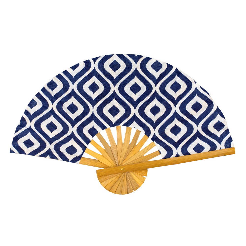 Crafted with a meticulous eye for detail, its cotton leaf unfurls to reveal a captivating geometric pattern in deep indigo and navy hues, reminiscent of traditional Japanese textiles. The natural bamboo ribs provide a gentle structure, their smooth, polished surface a pleasure to hold. Each movement creates a soft rustle, a subtle symphony of natural fibres responding to the air, offering both visual intrigue and a refreshing breeze.