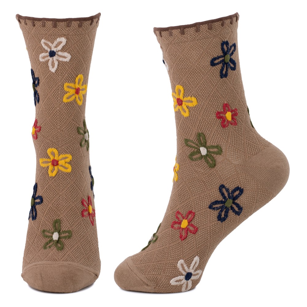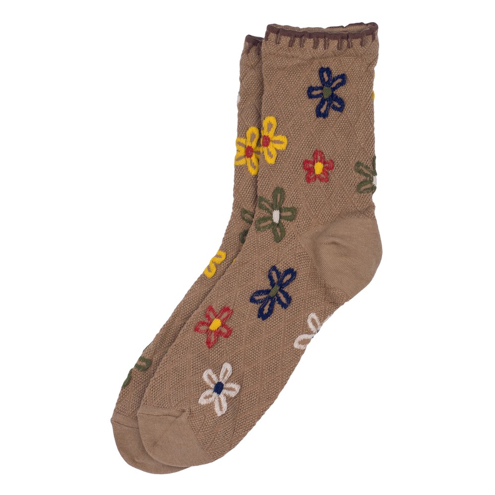 Socks cotton & spandex flower blanket stitch brown