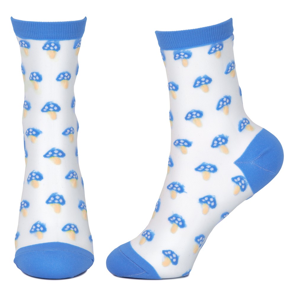 Crafted from a delicate blend of polyester and nylon, these socks possess a gossamer-like transparency that allows a subtle play of skin beneath. Each pair is a miniature canvas, featuring an artful scattering of whimsical fungi and botanical elements. The fine knit feels barely there, a whisper against the skin, yet the intricate patterns hold a surprising depth, inviting a closer look at their charming, organic forms.