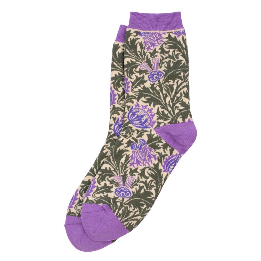 Step into a world of botanical elegance with these William Morris thistle socks. Featuring an intricate floral and leaf design in a delightful lilac purple and olive green against a creamy ivory backdrop, these socks will add a touch of whimsical charm to any outfit.