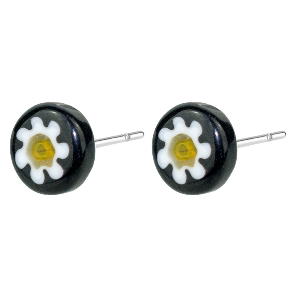 Crafted using the ancient millefiori technique, meaning ‘a thousand flowers’, each piece is a unique mosaic of vibrant glass canes. Molten glass is meticulously drawn and cut, revealing intricate floral and geometric patterns suspended within a smooth, polished surface. The resulting stud, though petite at 8mm, holds a captivating depth of colour and detail, inviting a closer look to uncover its individual narrative.