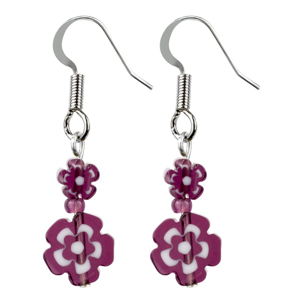Drop earring millefiori glass flower purple