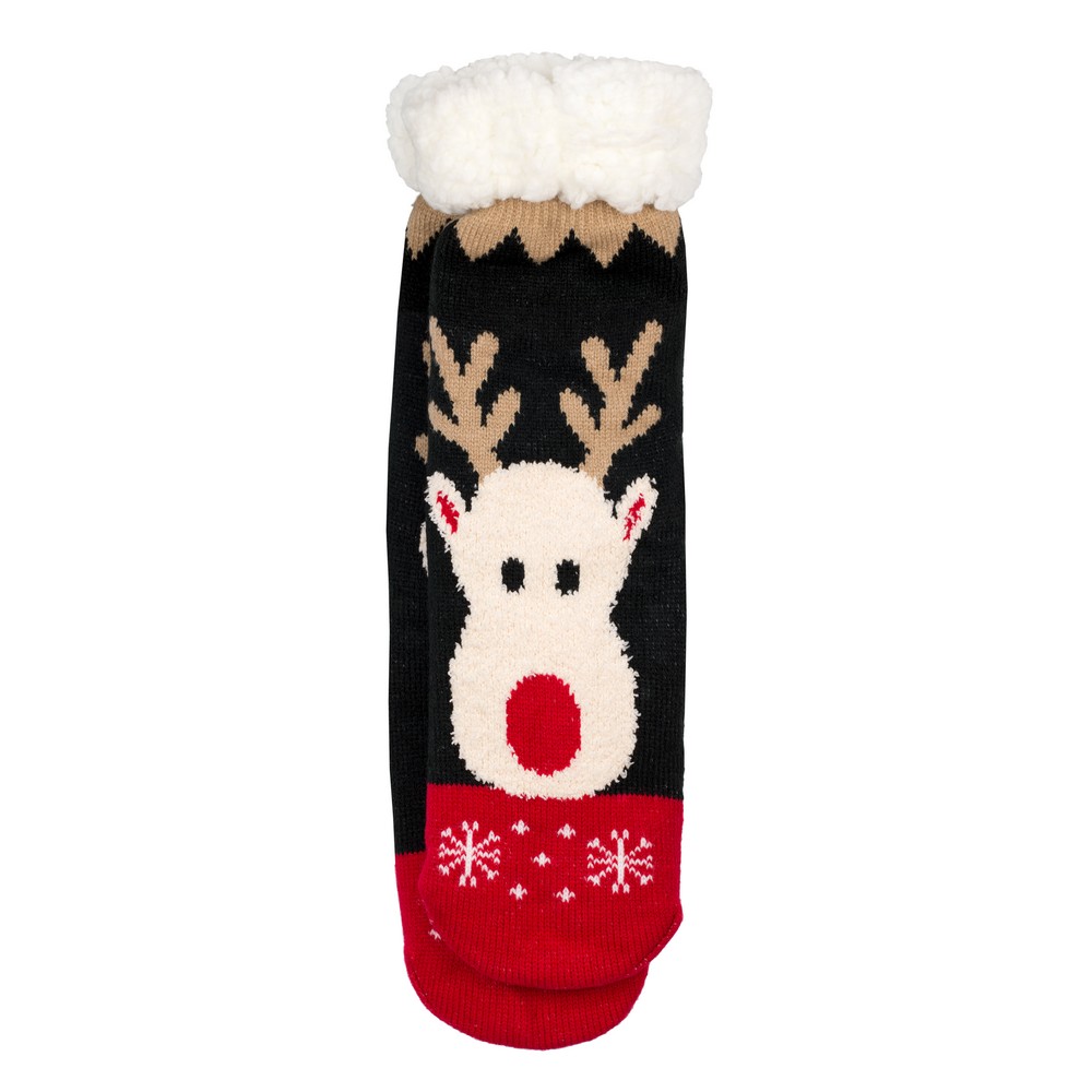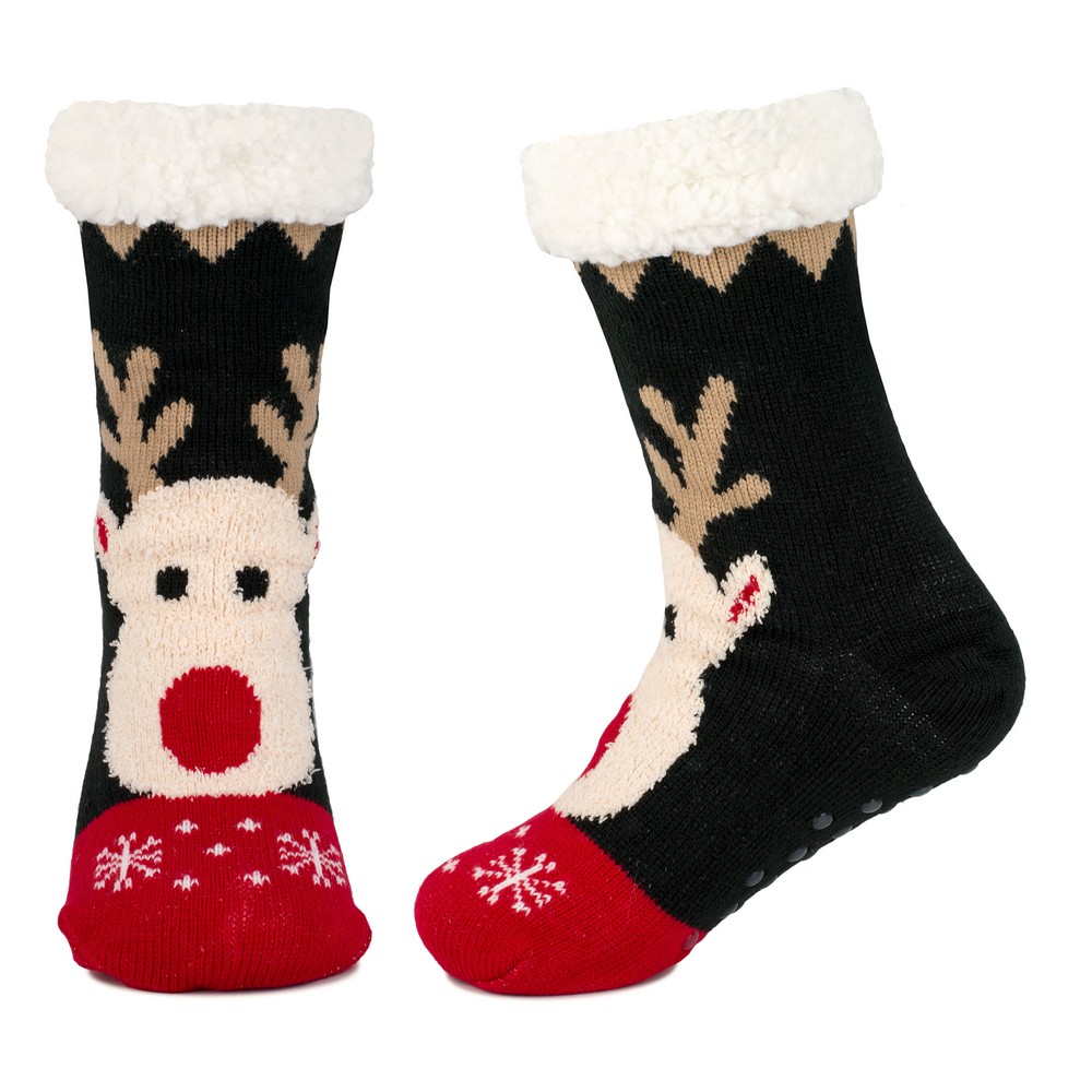 Stay cozy and festive with these Christmas-themed reindeer socks! Designed for warmth and comfort, these stylish socks feature a playful reindeer face with antlers and a bright red nose on a black background. The fluffy white cuff adds a soft and snug touch, resembling winter snow, while the red lower half is adorned with white snowflake patterns, enhancing the holiday spirit. Made from high-quality, insulating fabric, these socks are perfect for lounging at home or adding a cheerful seasonal flair to your outfit. An ideal holiday gift or a must-have winter essential, these festive socks combine comfort and charm effortlessly.