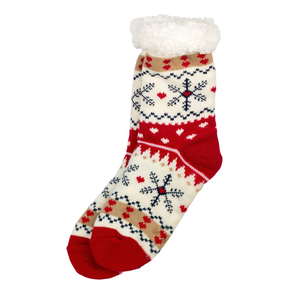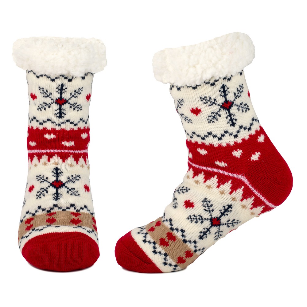 Stay warm and stylish with these festive winter socks, featuring a delightful blend of snowflakes, hearts, and geometric patterns in rich shades of red, white, beige, and navy blue. Crafted from soft, insulating fabric, these cozy socks provide warmth and comfort, making them perfect for chilly days. The fluffy white cuff adds an extra layer of snugness, ensuring a comfortable fit for lounging or wearing with boots. A perfect seasonal gift or a charming addition to your winter wardrobe, these socks combine festive flair with everyday practicality.