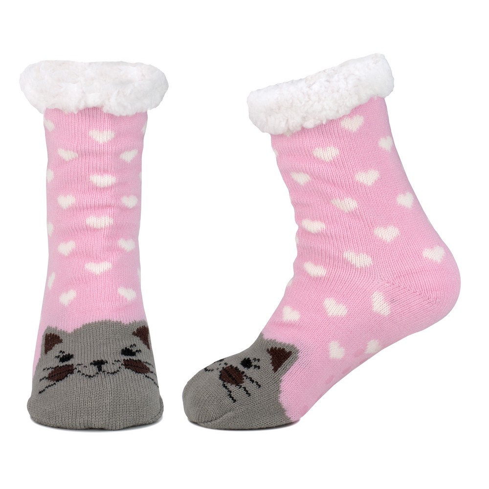 Stay cozy and stylish with these adorable pink heart-patterned socks featuring a sweet grey cat design near the toes and a plush white fleece cuff. Perfect for lounging at home or adding a playful touch to your outfit, these socks offer warmth and comfort while showcasing a fun, whimsical aesthetic. Crafted with soft and breathable materials, they provide a snug yet gentle fit, making them an excellent choice for chilly days or as a delightful gift for cat lovers.