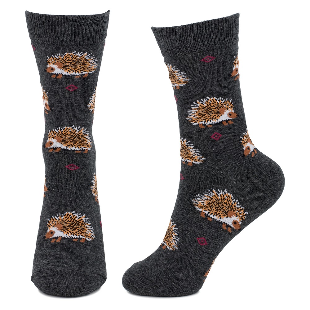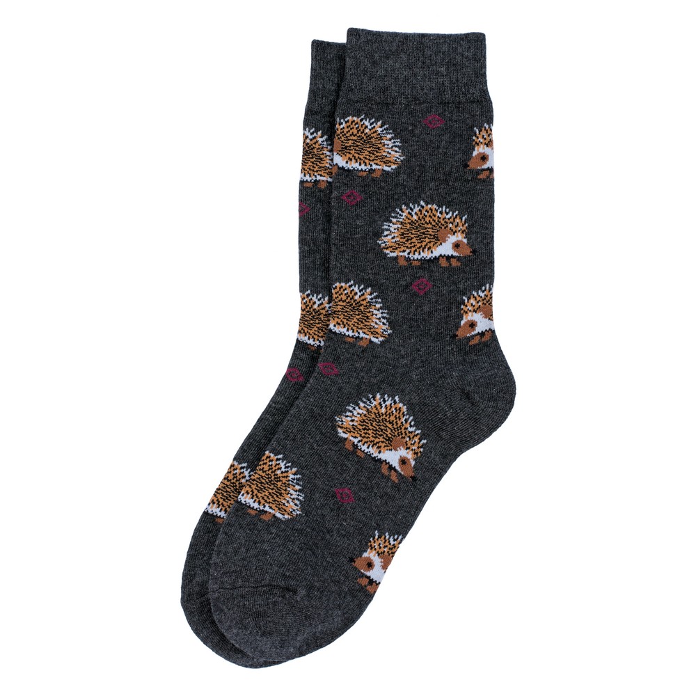 Keep it cozy and cute with these grey hedgehog socks. Featuring a soft grey base with charming brown-and-white hedgehogs and subtle diamond accents, these crew socks offer a playful twist on everyday comfort. Perfect for nature lovers and anyone who appreciates a touch of woodland whimsy in their wardrobe.