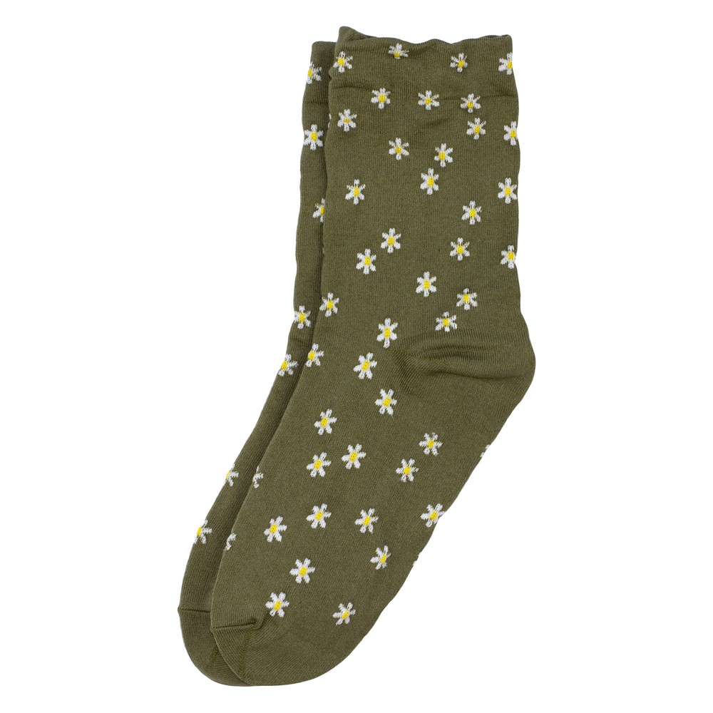 Elevate your style with our charming olive green daisy crew socks. This unique colour combination pairs a rich, earthy olive green base with a lively pattern of daisies, creating a look that’s both trendy and timeless. They’re perfect for adding a pop of personality to your favorite boots or sneakers while keeping a stylish, grounded aesthetic. Crafted from a soft, breathable cotton blend, these crew socks are as comfortable as they are cute. The stretchy fit ensures all-day comfort, and their durable design means they’ll be a favorite in your sock drawer for a long time. Whether you’re a fan of nature-inspired fashion or simply looking for a fun new accessory, these olive green daisy socks are a must-have.